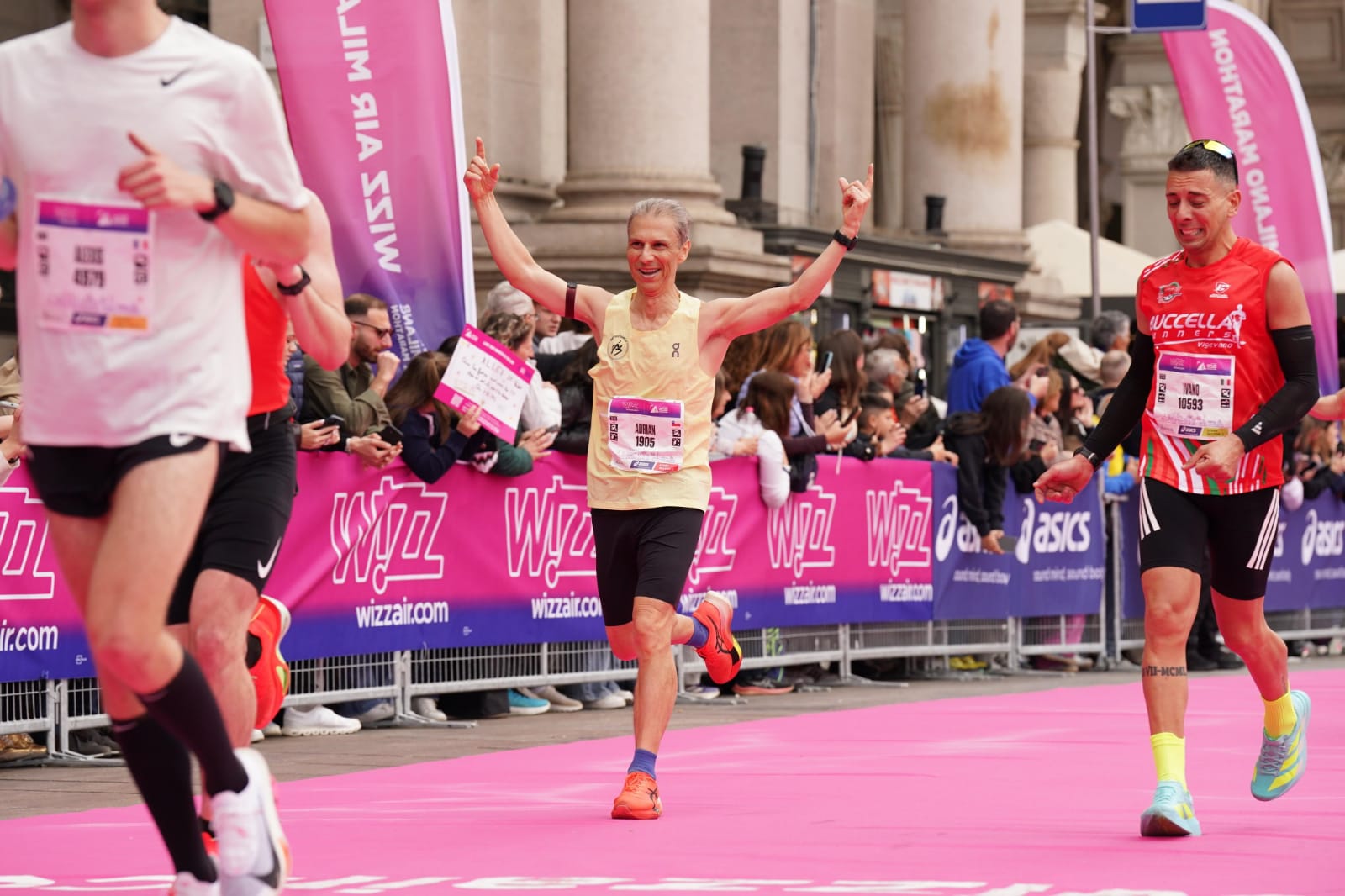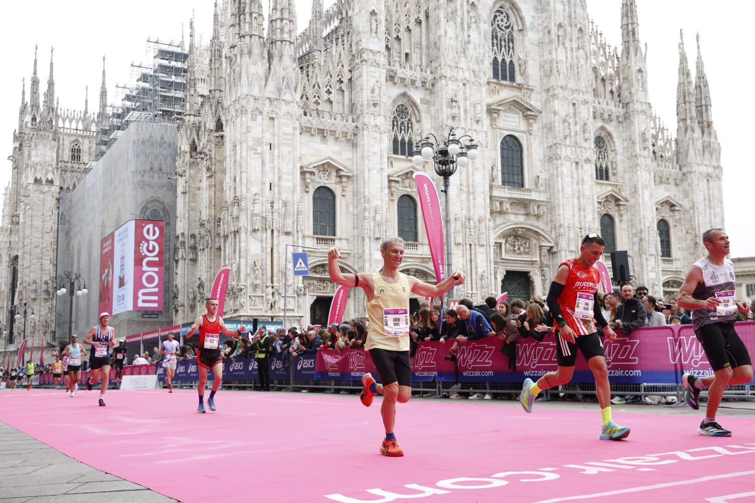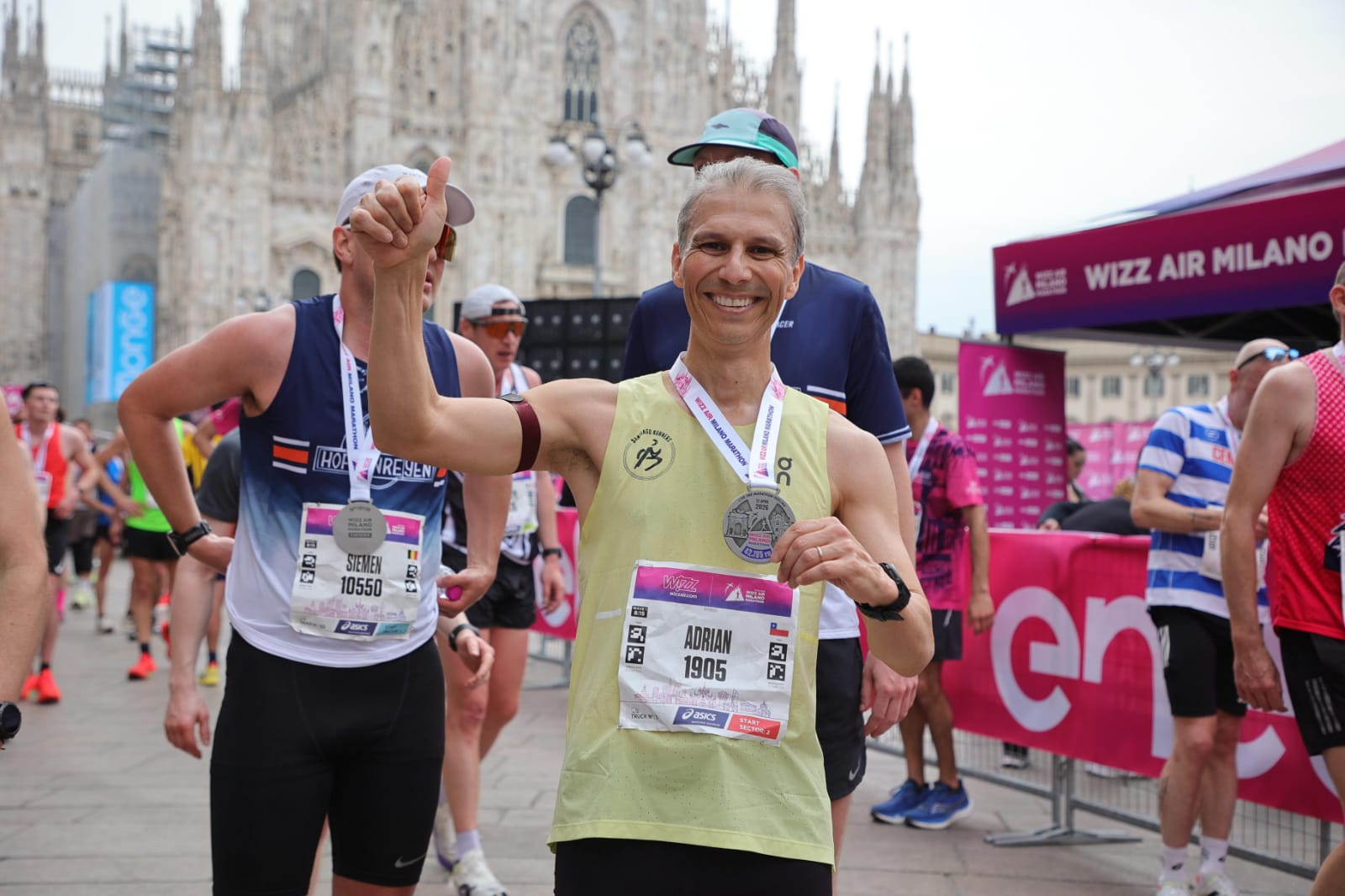 Cuando finalmente en San Babila veo el letrero de 41K le meto en serio a 4:15m/km, ya no iba a ser 3h12m pero no quería que se me escapara el 3h13m. Últimos 200m con la galería Vittorio Emmanuelle a mi derecha y el Duomo a mi izquierda, alfombra fucsia, levanto los brazos, girando las manos en celebración y cruzo la meta en 3:13:39. Requete conforme, no tanto por mi crono como por haber repuntado y ser valiente para decidir rematar tan anticipadamente, aprovechando el suave descenso.