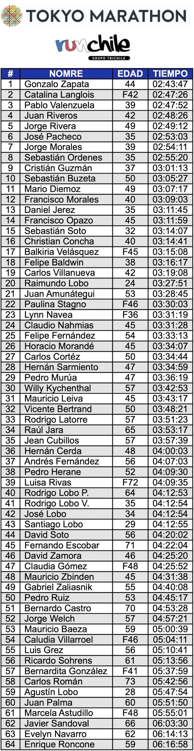 En total 64 chilenos cruzaron la meta, 55 hombres y 9 mujeres, donde 8 chilenos bajaron las 3 horas y 2 chilenas las 3:30. A continuación, el listado completo de los 64 chilenos. Felicitaciones a todos/as!