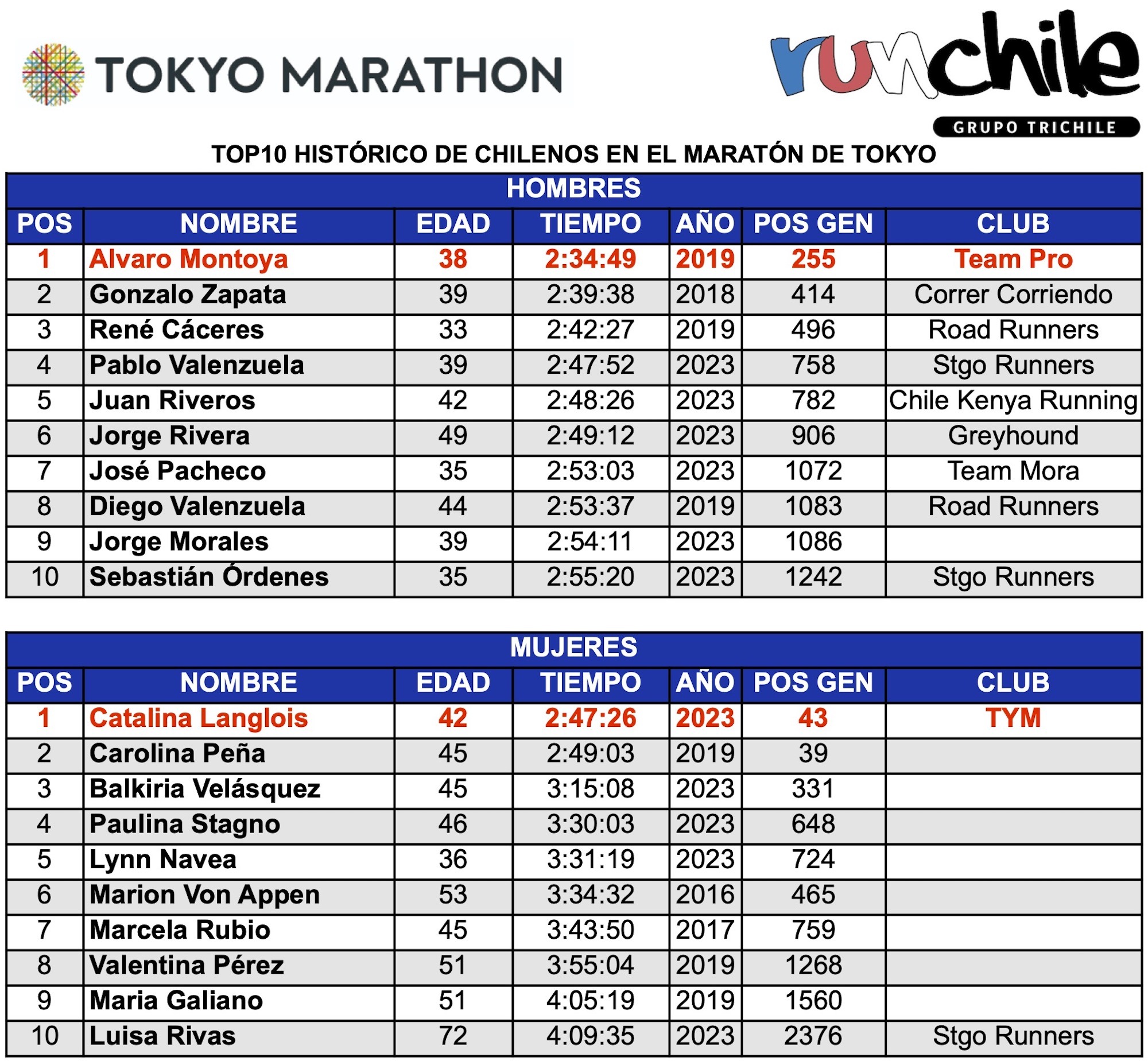 Comenzaron los Majors del año con la edición 2023 del Maratón de Tokio, donde luego de varios años de limitaciones por la pandemia del Covid (2020, 2021 y 2022), 64 chilenos dijeron presentes en la carrera nipona, donde los mejores nacionales fueron Gonzalo Zapata (Atleta adidas) con 2:43:47, mientras que en mujeres (segunda entre los chilenos) fue Catalina Langlois (Atleta Asics) con 2:47:26.