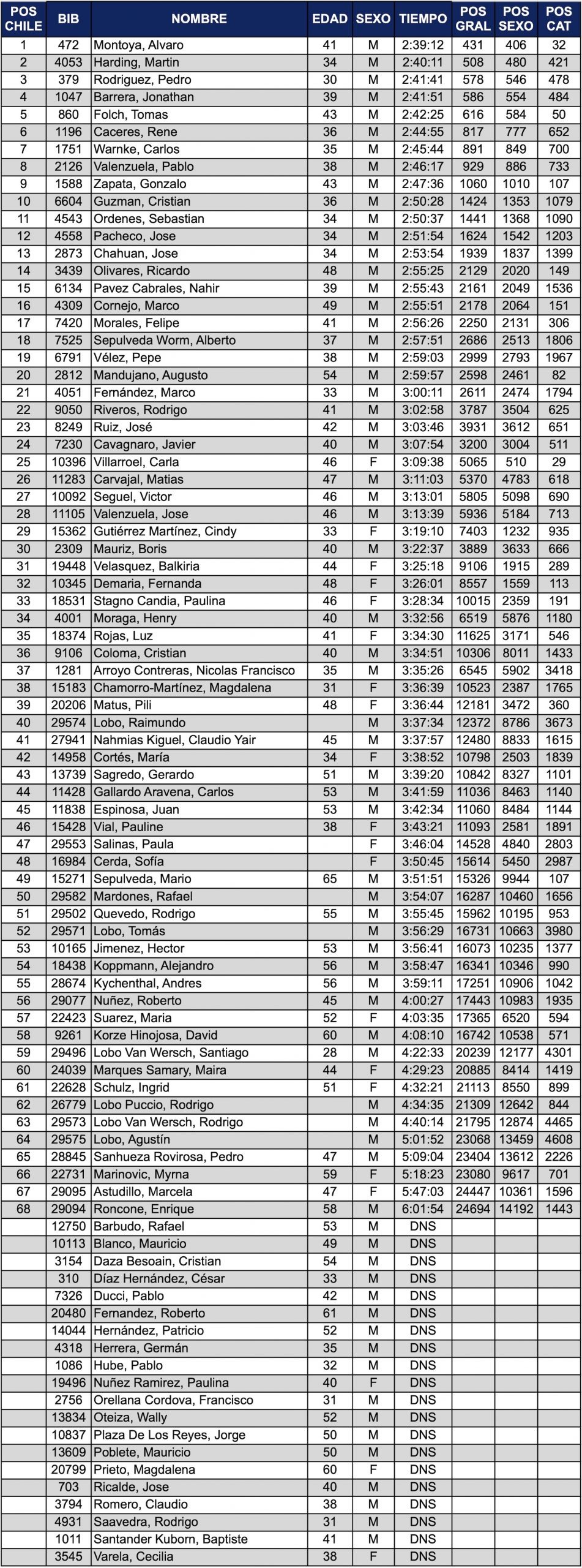 Completaron el podio chileno Martín Harding con 2:40:11, que también ingresó al Top10 con 8vo lugar, y el iquiqueño Pedro Rodríguez con 2:41:41 y un 10mo lugar en el Top10.