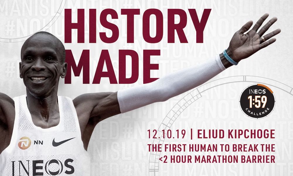 El registro no será validado como la mejor marca en un maratón, pero seguramente el 12 de octubre de 2019 será recordado por todos nosotros como el día que un ser humano, llamado Eliud Kipchoge, logró lo impensado, correr los 42.195 metros de la tradicional puebla de atletismo en menos de 2 horas. Gracias Kipchoge por demostrar que el ser humano no tiene límites!!!
