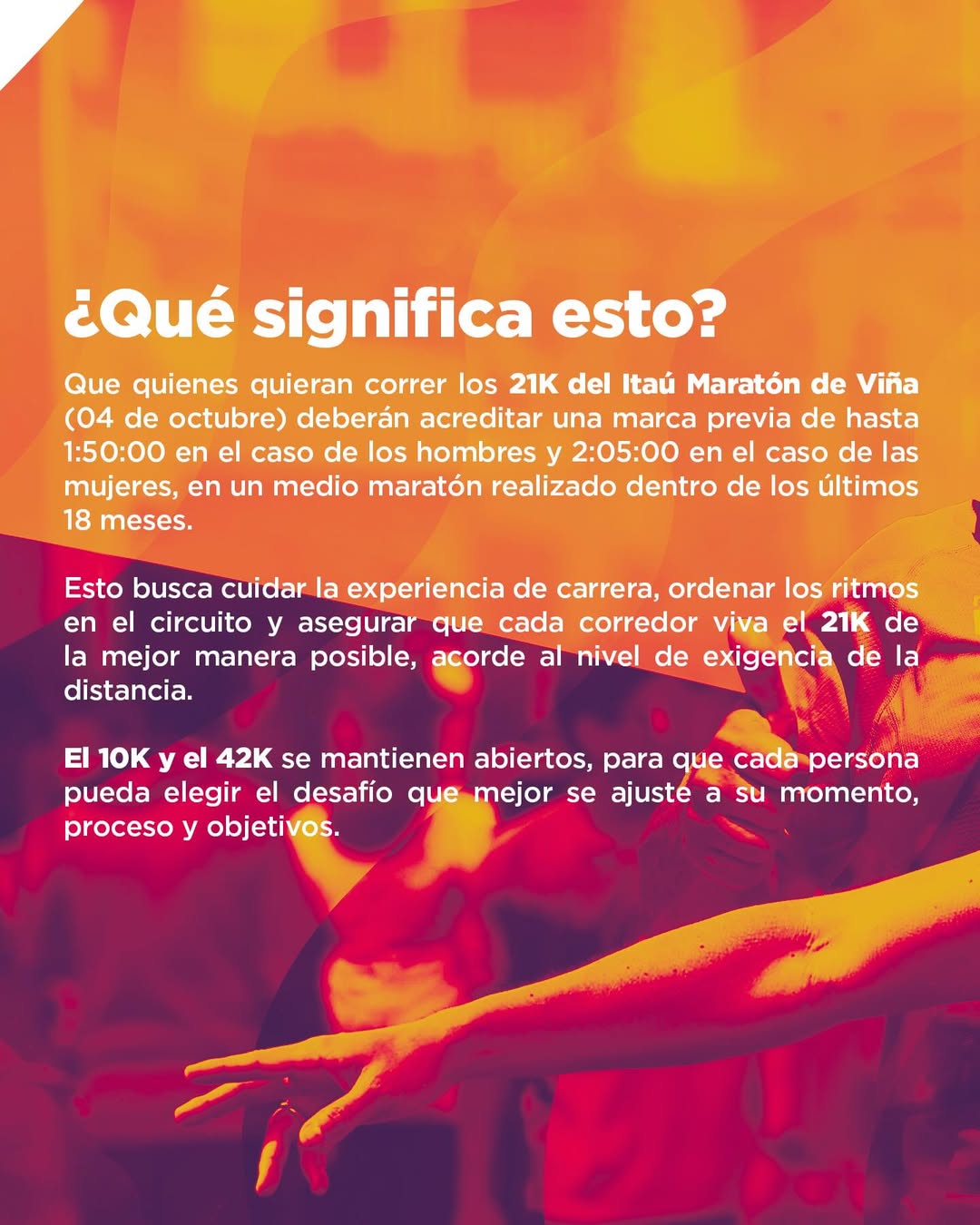 “Porque creemos que elevar el estándar también es cuidar la experiencia de carrera: ordenar ritmos, mejorar la dinámica del circuito y asegurar que cada corredor viva el 21K de acuerdo a su nivel de preparación”, explican en el comunicado.